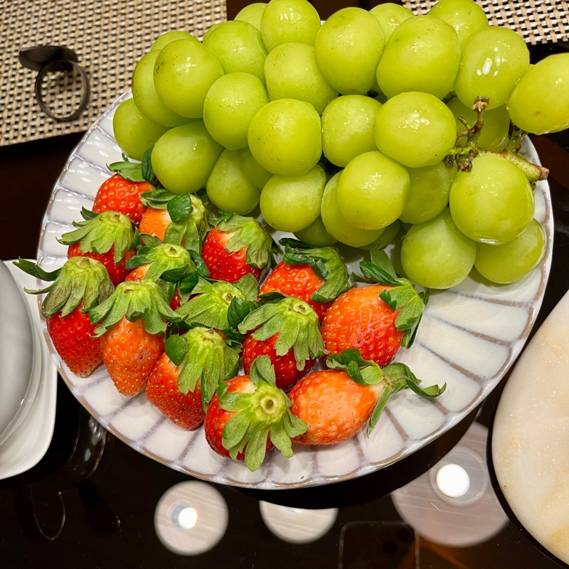 Dessert was a tray of crisp moscat and sweet, fresh strawberries. They were complimented with a melt in the mouth mango roll brought by our daughtet. A perfect ending to a perfect meal.