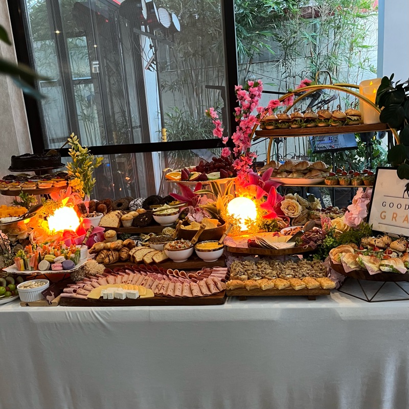 One wall of the living room was transformed into a feast for the eyes and the palate. The grazing table was artfully and lavishly arranged with bite-sized delights—fresh fruits, pastries, nuts, cheeses, cold cuts, and flavorful dips. It was hard to know where to start!
