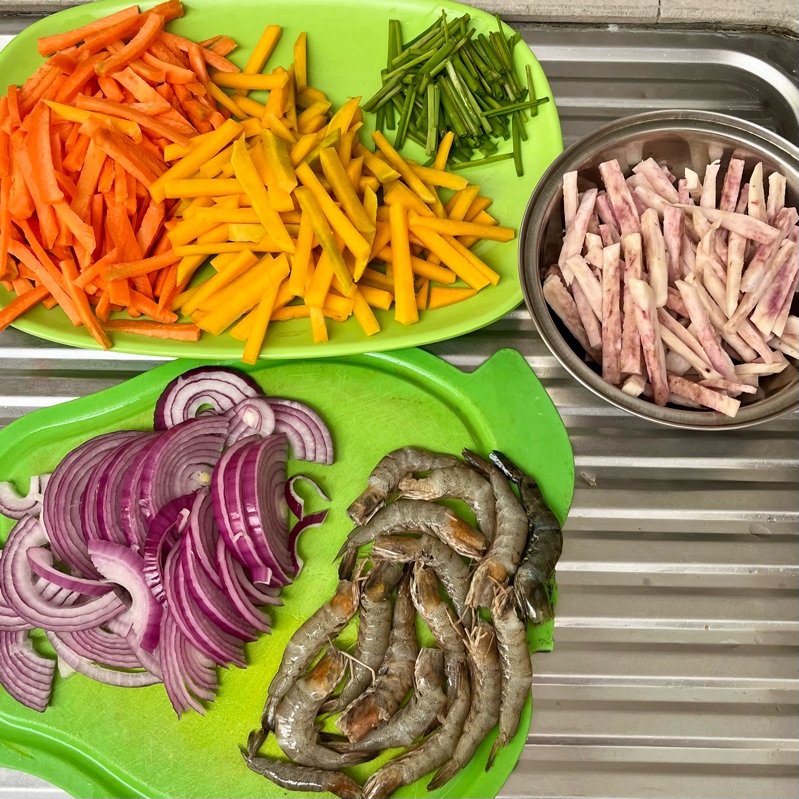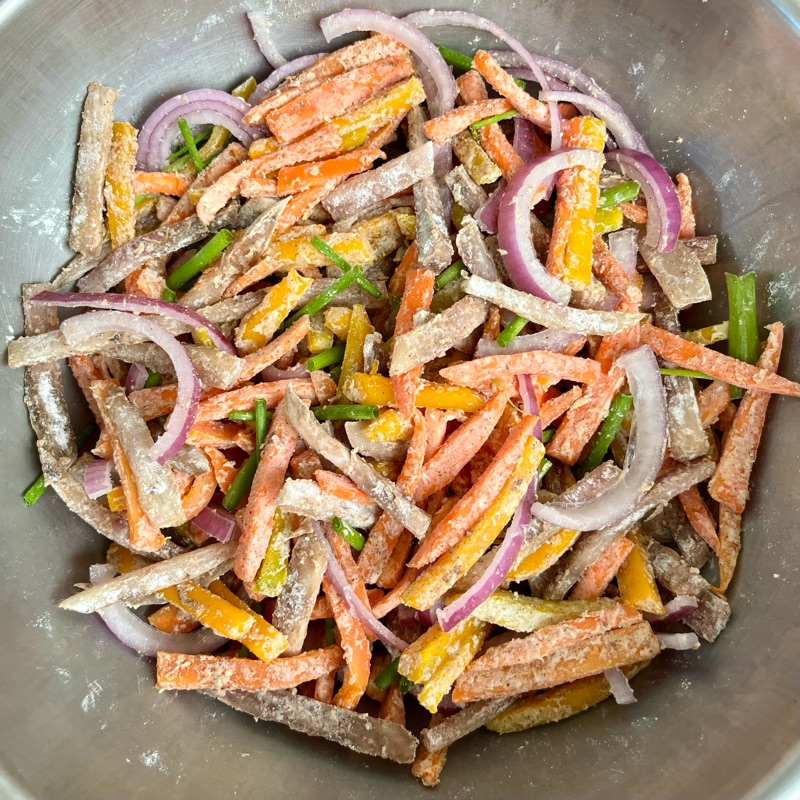 I used a carrot, a sweet potato, and an equal amount of pumpkin, all cut into similar-sized strips. I added red onions and spring onions, too.
