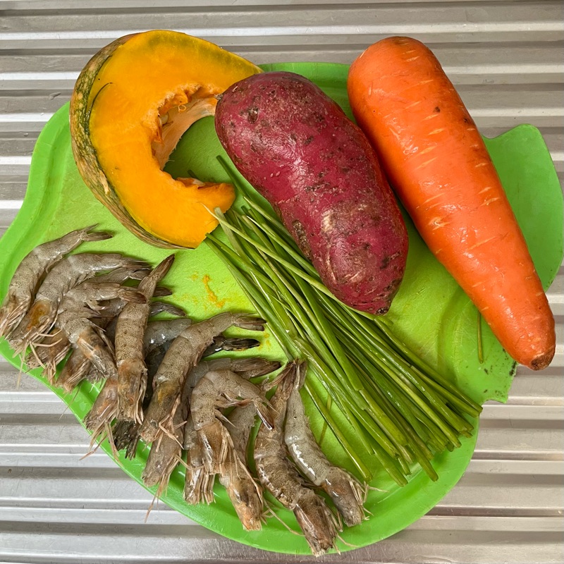 I tossed the vegetables with half a cup of tempura mix, a pinch of salt and pepper, and topped them with small shrimps, their heads neatly clipped
