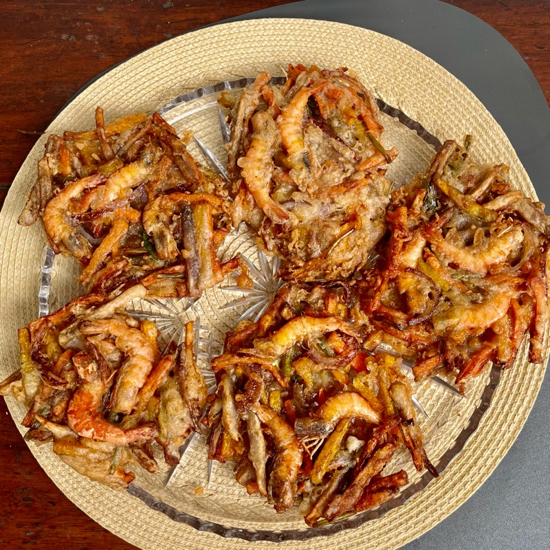 To cook, I poured a little oil into a saucer, laid down the vegetable mixture, topped it with three shrimps, drizzled generously with batter, and deep-fried until golden and crisp.